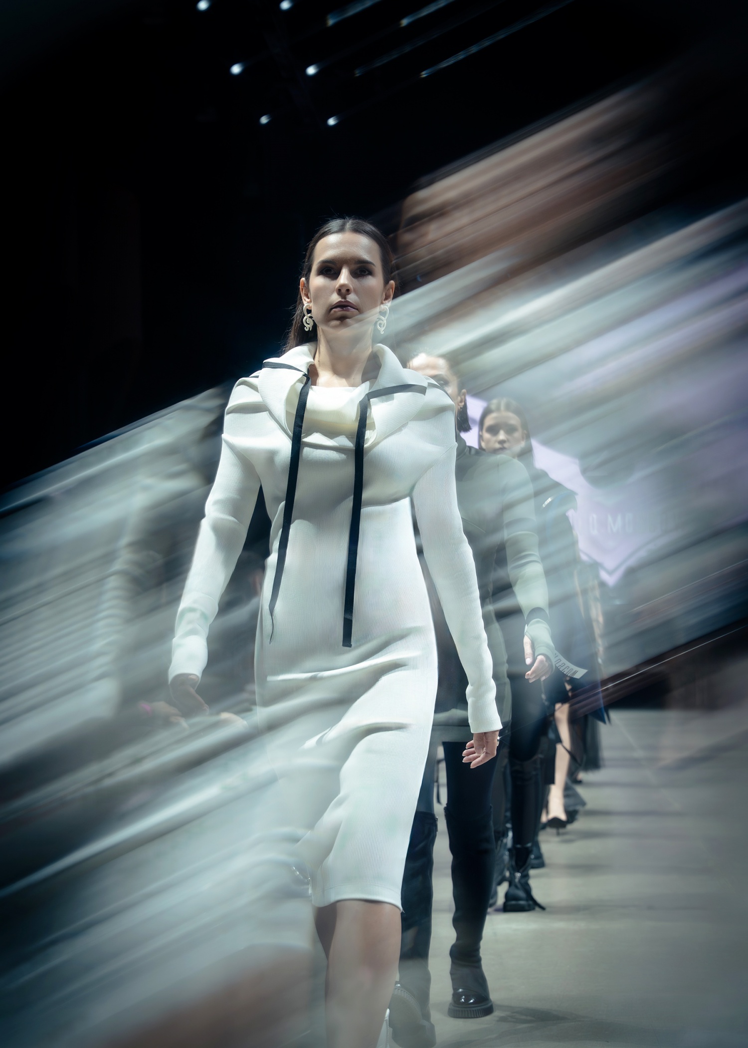 Платье выполнено из трикотажа-лапши с высокой степенью растяжимости.