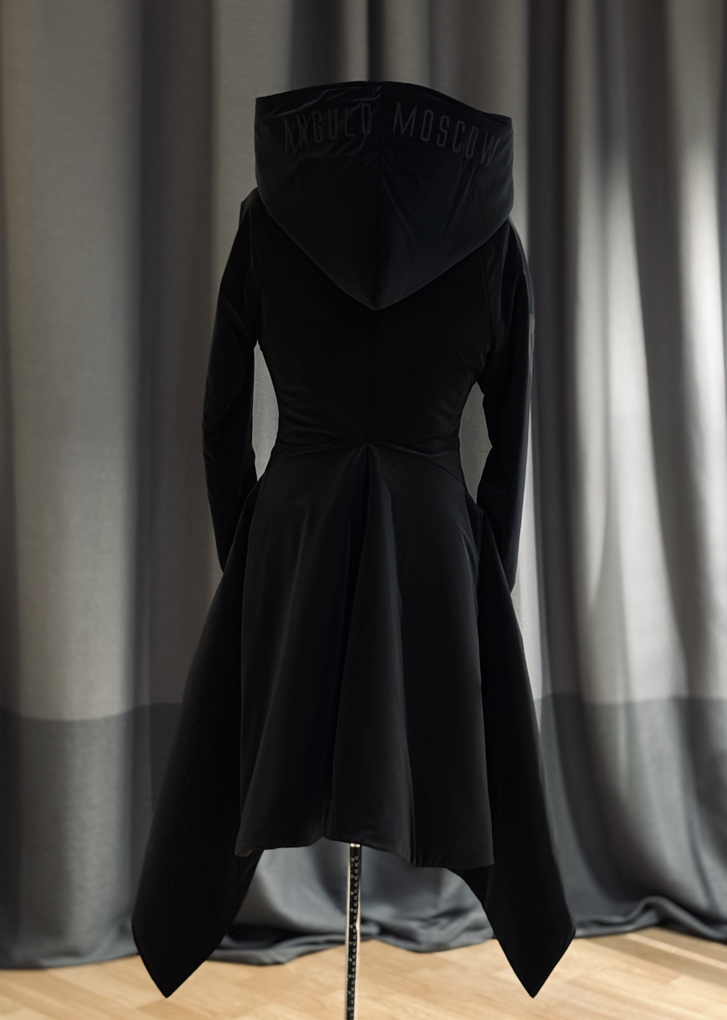 Зимняя куртка из нежнейшего материала с бархатистой текстурой. Приталенный силуэт и пышная юбка создают женственный образ, а объёмный капюшон с логотипом добавляет стиля.