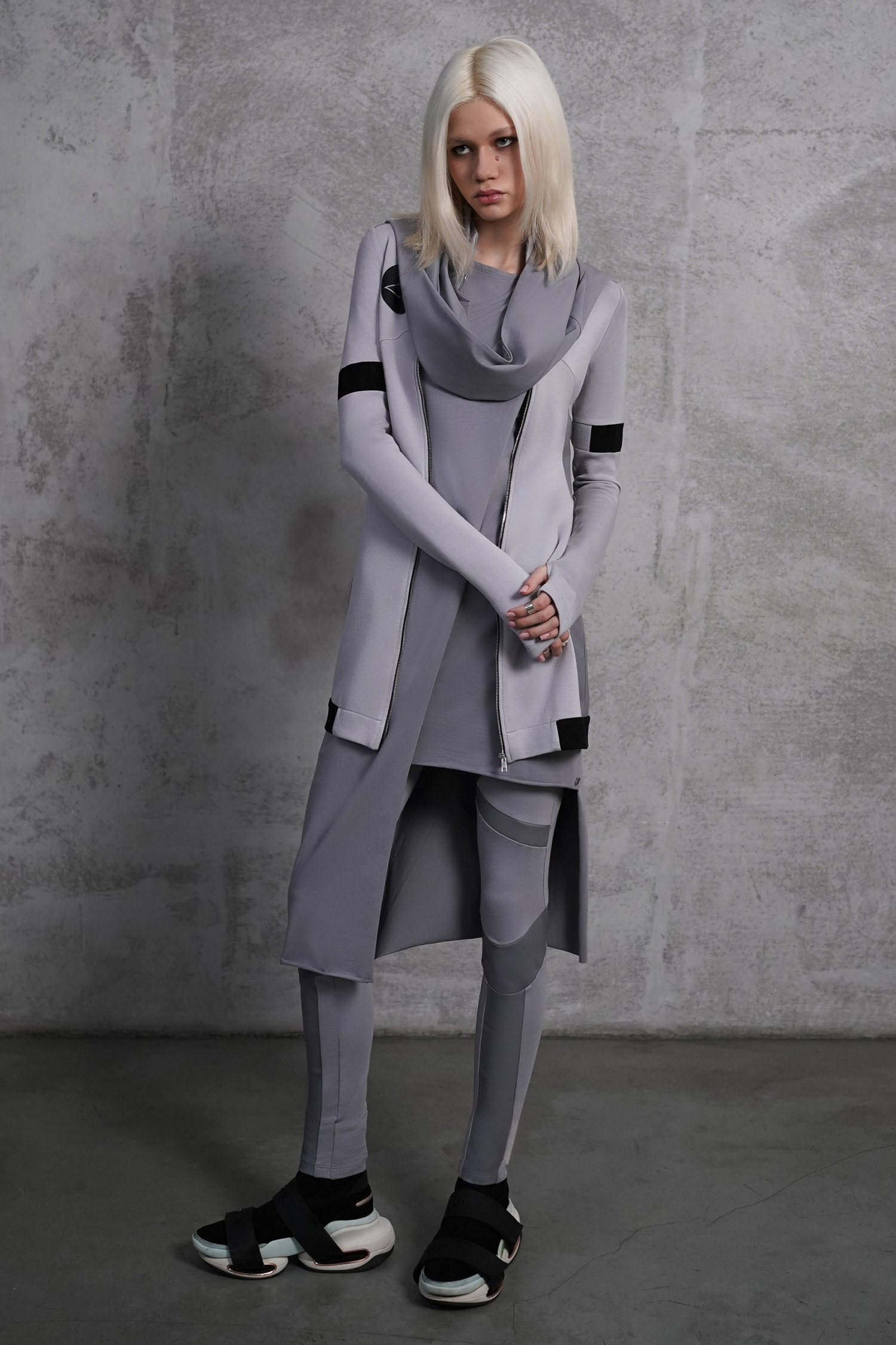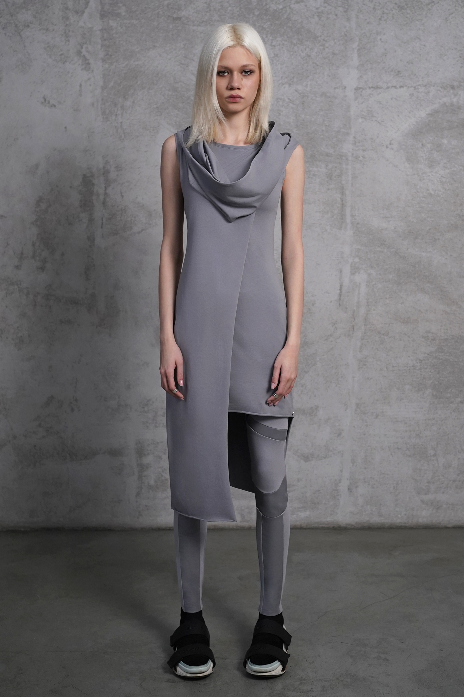Оригинальное асимметричное платье с открытой спиной. В комплекте съемный капюшон-снуд, который можно надеть тремя способами: в два обхвата вокруг шеи, перекинуть за спину или оставить в роли аксессуара спереди.