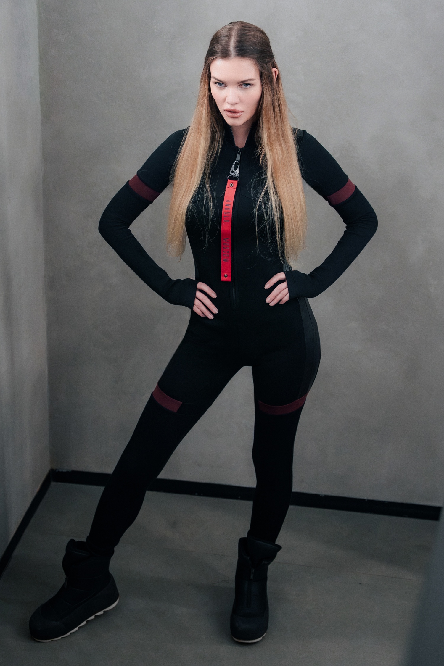 Эффектный и при этом тёплый комбинезон чёрного цвета выполнен из нежной, словно шёлк, плотной дышащей вискозы, контрастные вставки из эко-замши. На спинке, по бокам и на плечах декоративные вставки из искусственной кожи, комбинированный воротник из вискозы и эко кожи, приталенный силуэт, водонепроницаемая молния.