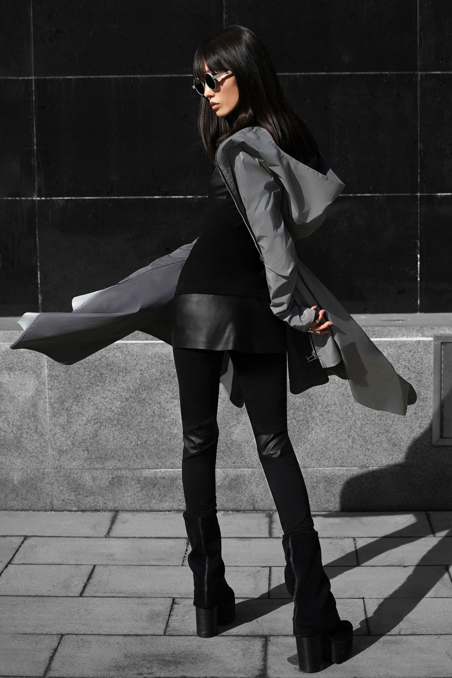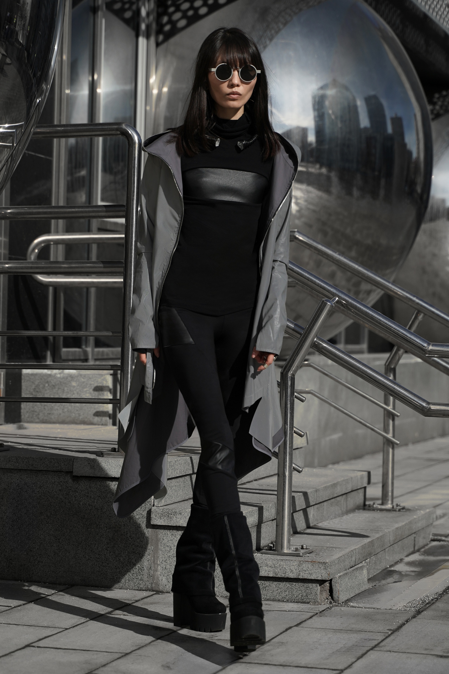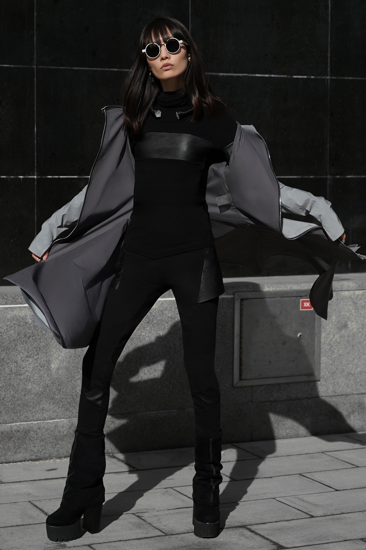 Концептуальные леггинсы из плотного хлопка с симметричными вставками и короткой юбкой из искусственной кожи. Модель сочетает комфорт натурального материала и дерзкий акцент экокожи, создавая стильный и функциональный образ.