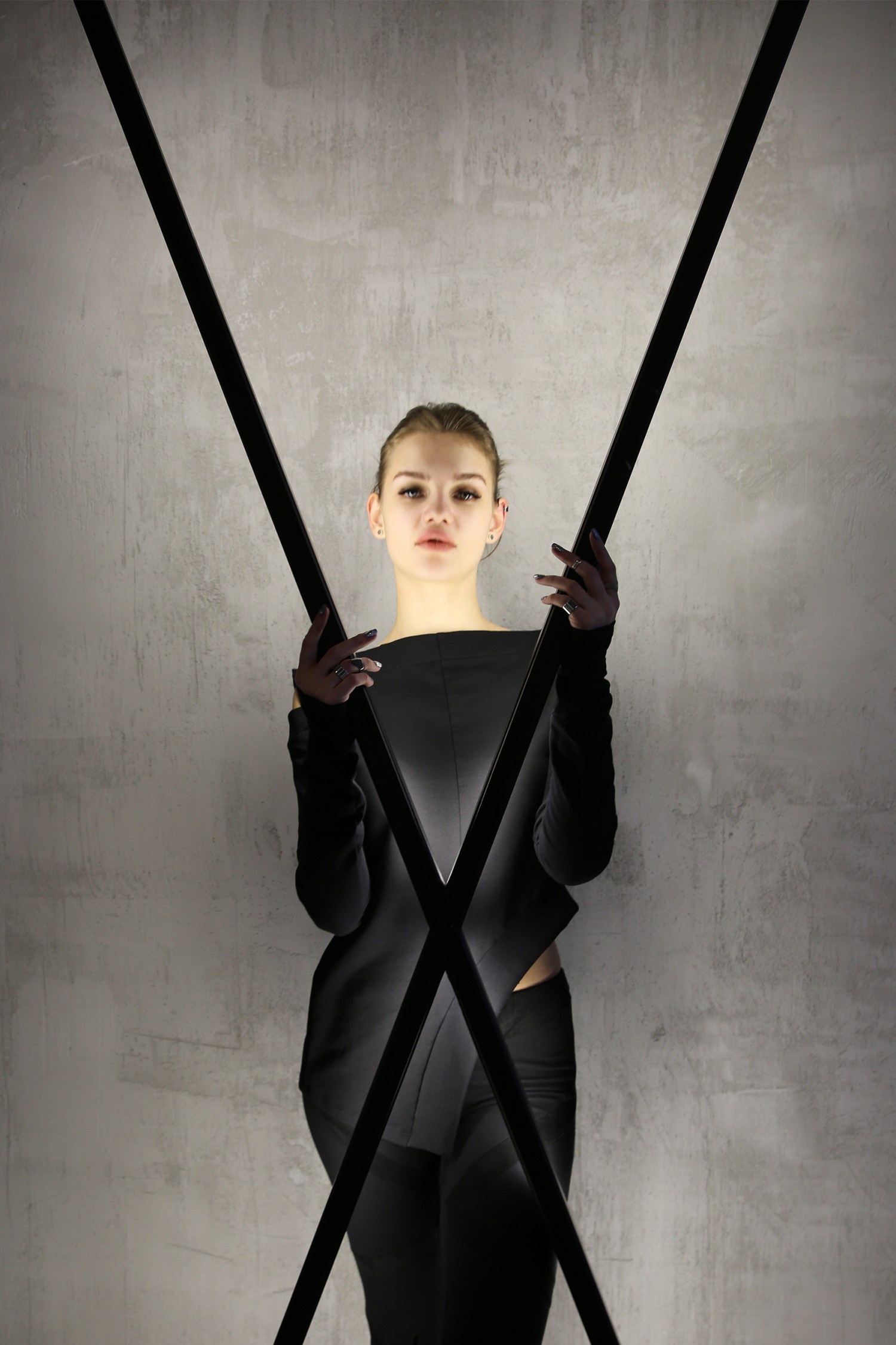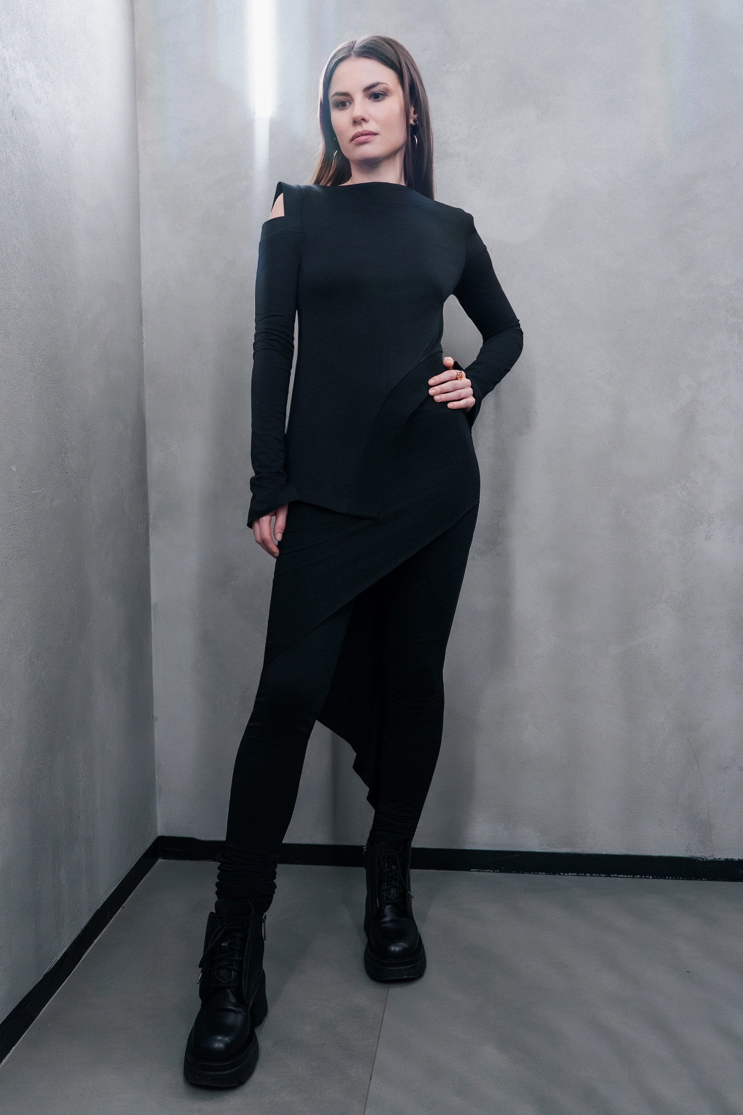 Необычный дизайн кроп-топа с длинными рукавами создан благодаря асимметричному крою.